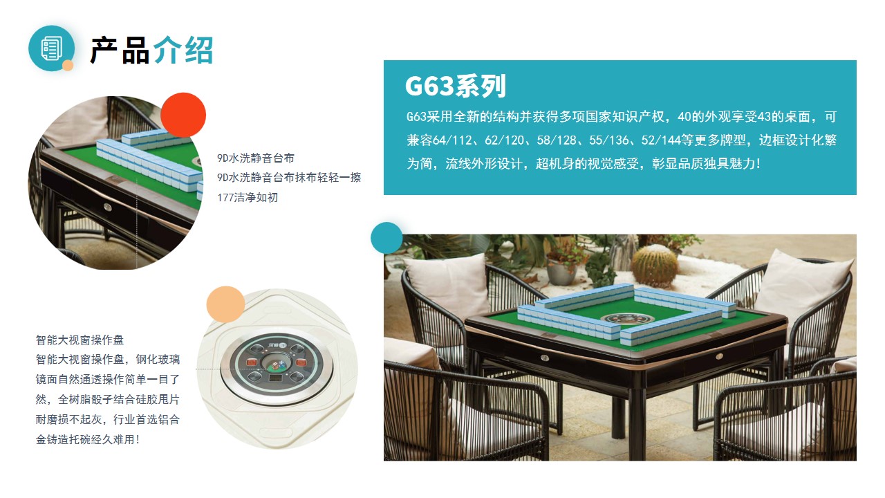 国川G63使用时代推升结构具有洗牌快、声音轻运行稳、不卡牌等特点专为四川、江西、湖北、云南、海南等地特殊机型量身研制,自主设计开拥有多项知识产权,可以搭配时代、畅享、未徕三款不同风格的边框来满足用户的需求!